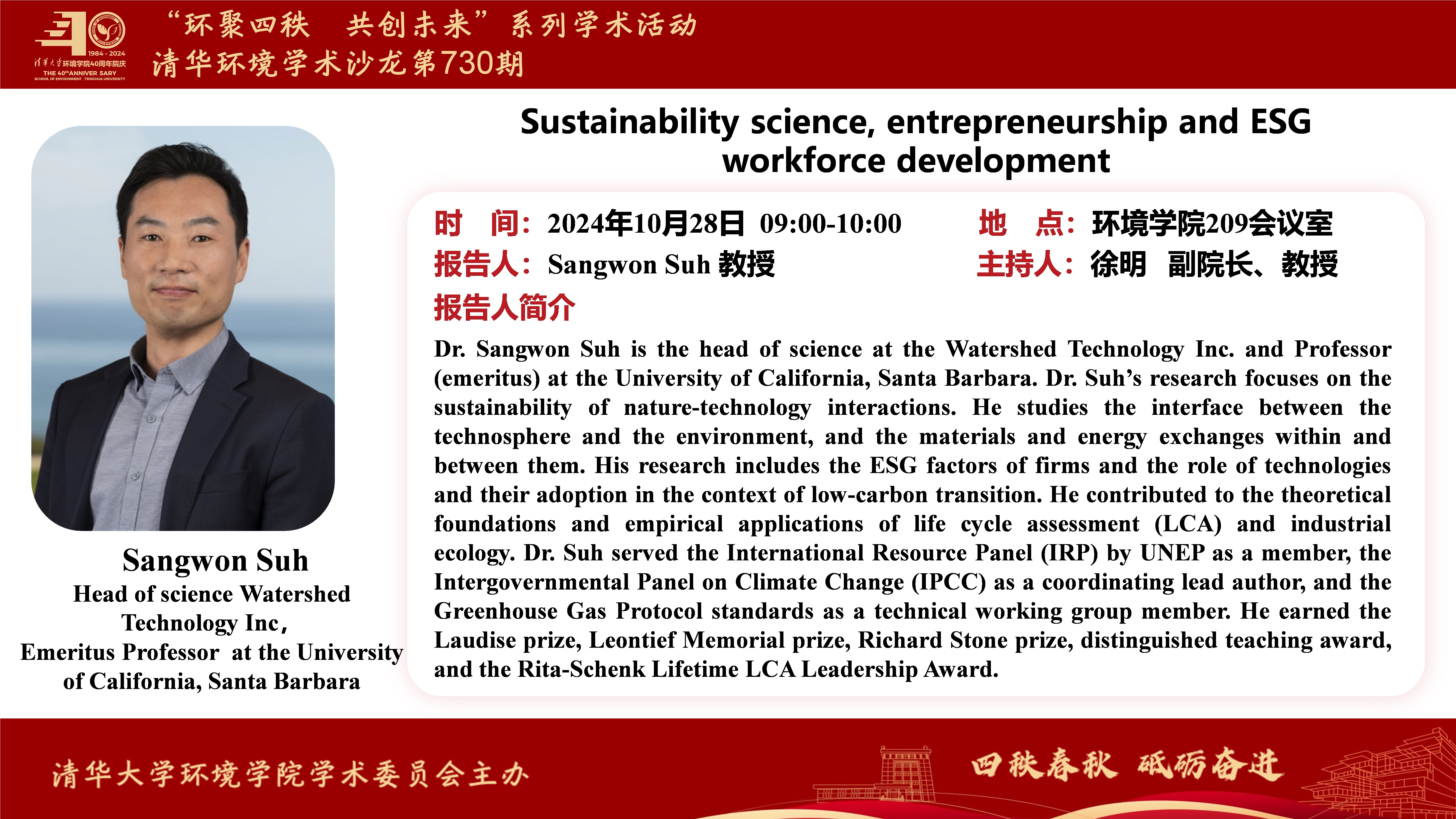 报告人:Dr. Sangwon Suh,Emeritus Professor at the University of California, Santa Barbara