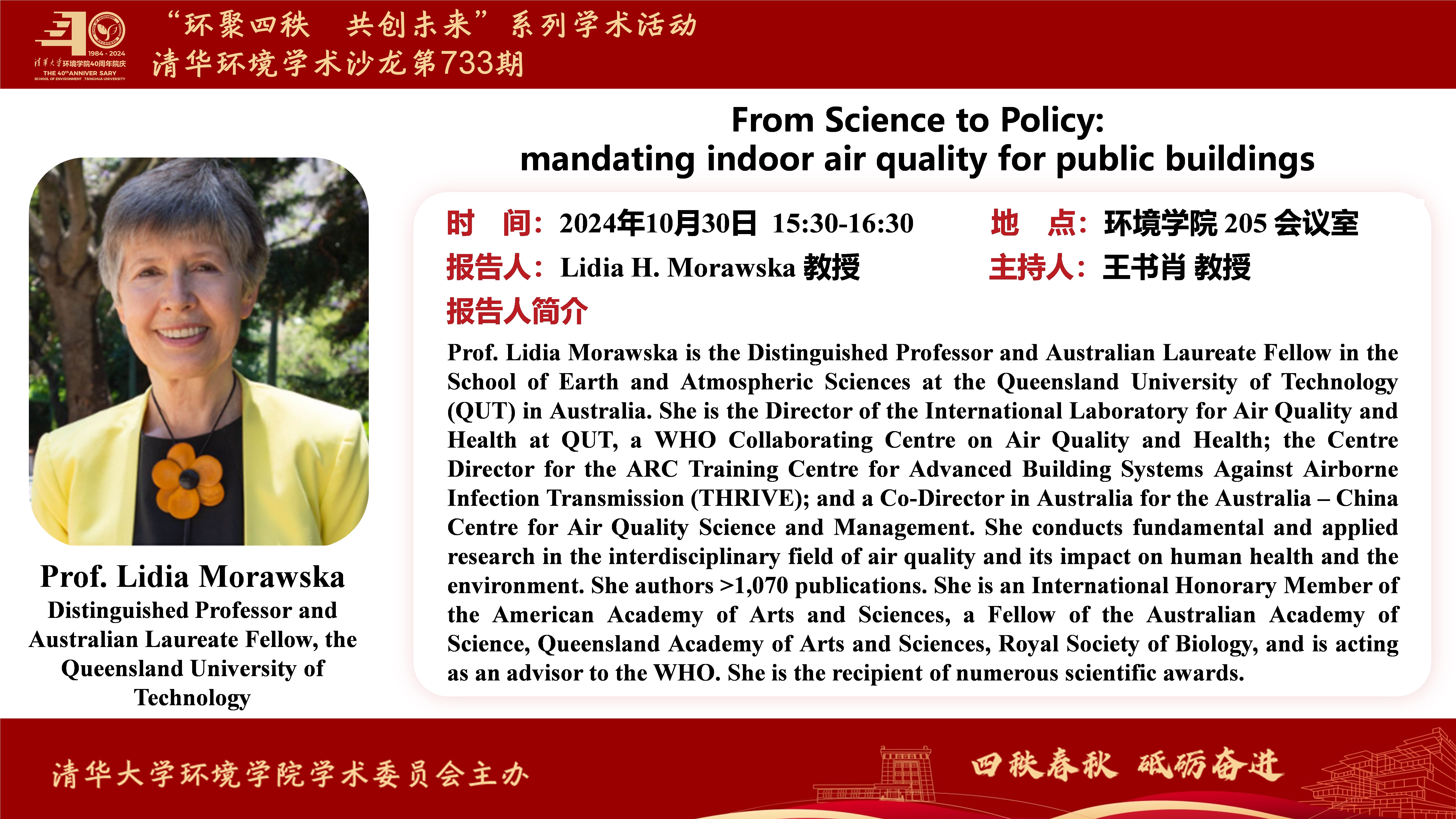 报告人2:Lidia Morawska教授, the Distinguished Professor and Australian Laureate Fellow in the School of Earth and Atmospheric Sciences at the Queensland University of Technology