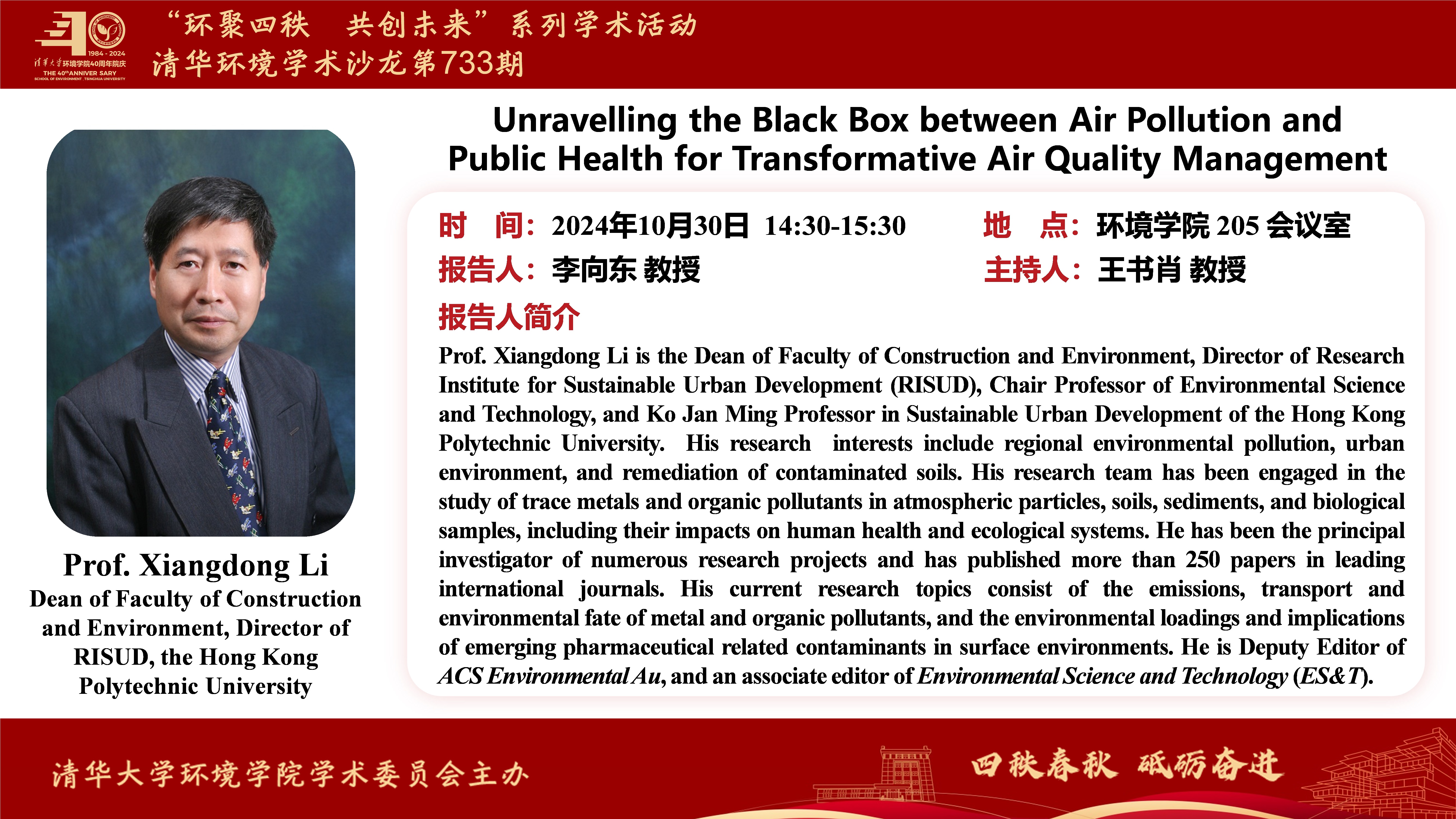 报告人1:李向东教授,Dean of Faculty of Construction and Environment, Director of Research Institute for Sustainable Urban Development (RISUD), Chair Professor of Environmental Science and Technology, and Ko Jan Ming Professor in Sustainable Urban Development of the Hong Kong Polytechnic University