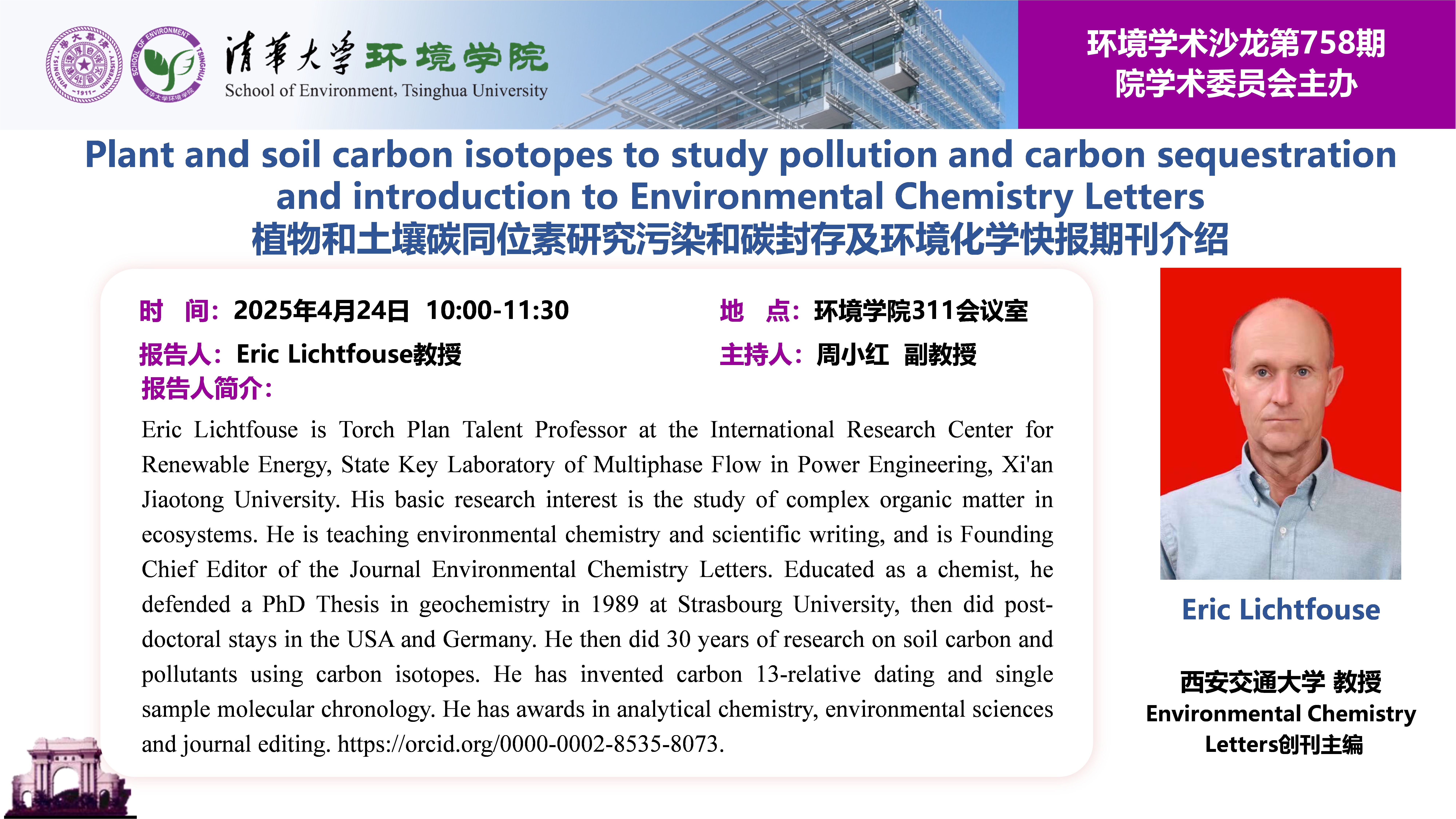 报告人:Eric Lichtfouse 西安交通大学 教授,Environmental Chemistry Letters创刊主编