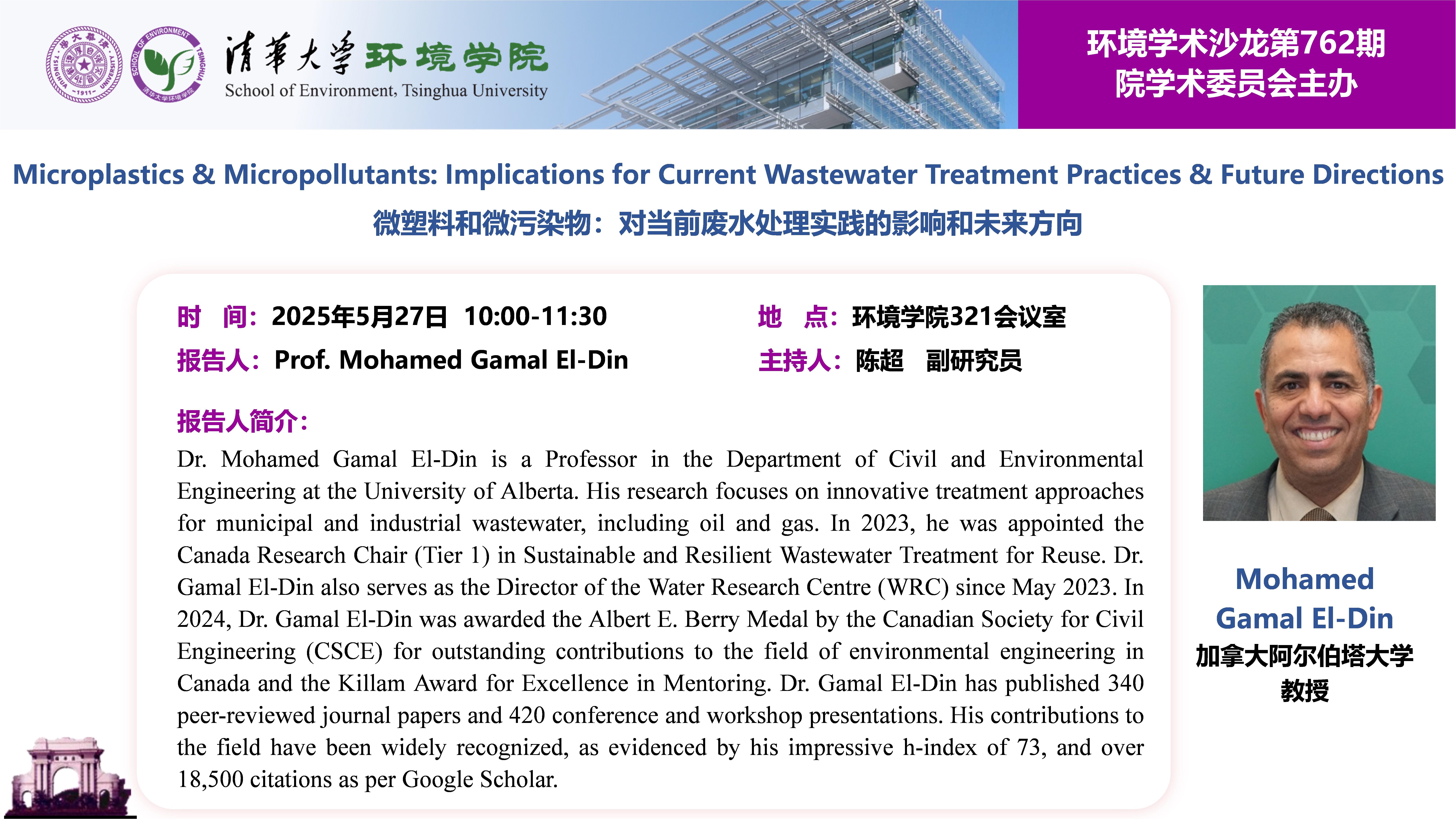 报告人:Mohamed Gamal El-Din,加拿大阿尔伯塔大学(University of Alberta)教授