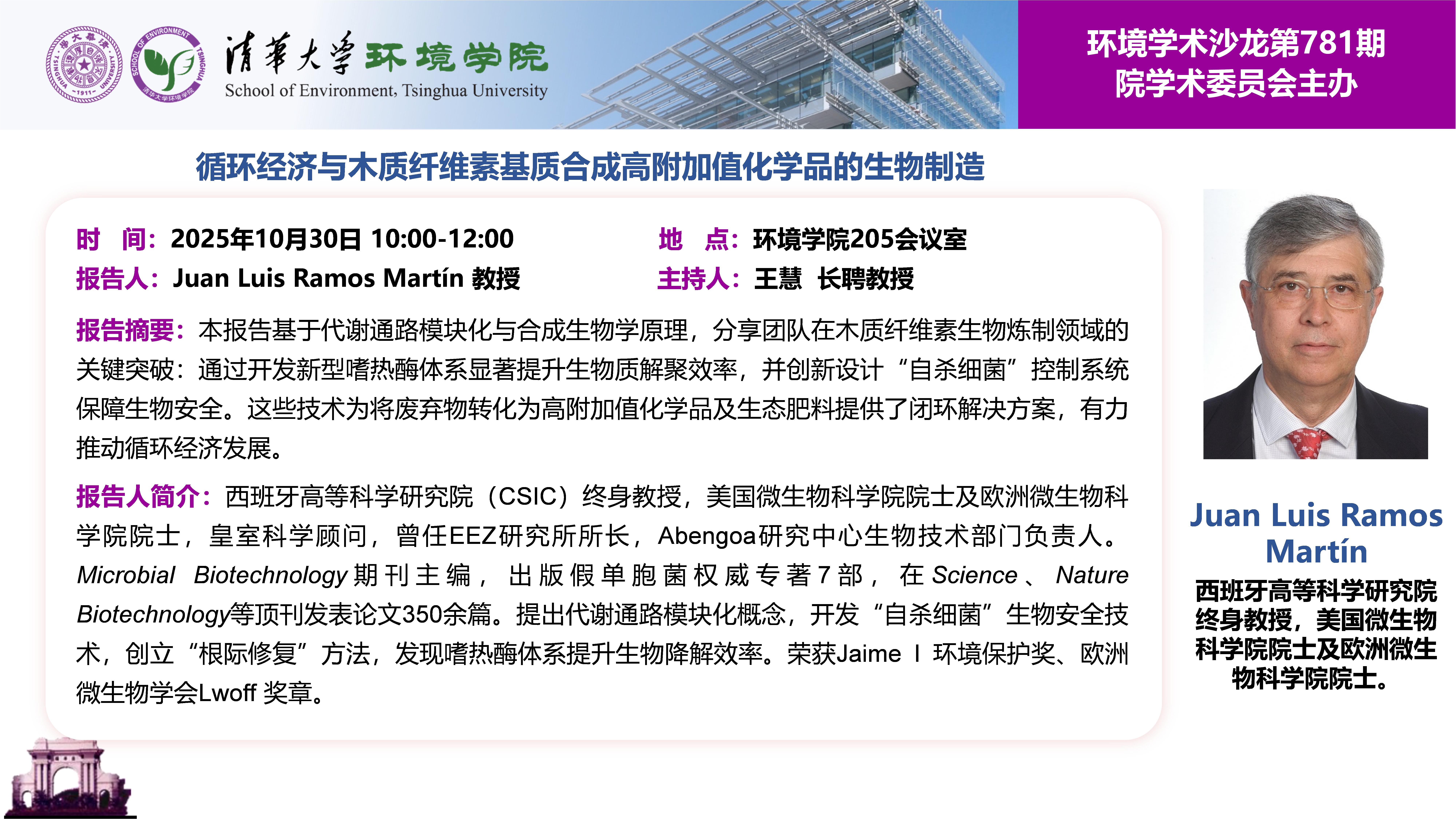 Juan Luis Ramos Martín,西班牙高等科学研究院(CSIC)终身教授,美国微生物科学院院士及欧洲微生物科学院院士,王室科学顾问,曾任EEZ研究所所长,Abengoa研究中心生物技术部门负责人。Microbial Biotechnology期刊主编,出版假单胞菌权威专著7部,在Science、Nature Biotechnology等顶刊发表论文350余篇。提出代谢通路模块化概念,开发“自杀细菌”生物安全技术,创立 “根际修复”方法,发现嗜热酶体系提升生物降解效率。荣获Jaime I环境保护奖、欧洲微生物学会Lwoff奖章。