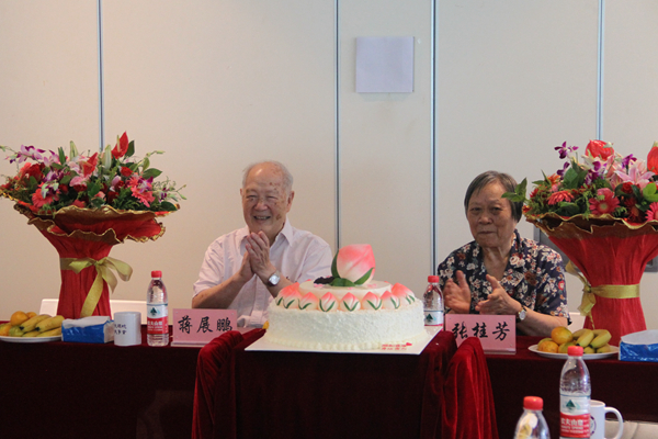 随后,贺克斌和刘毅代表学院向张桂芳、蒋展鹏两位先生送上了贺礼,青年教师向寿星献花。