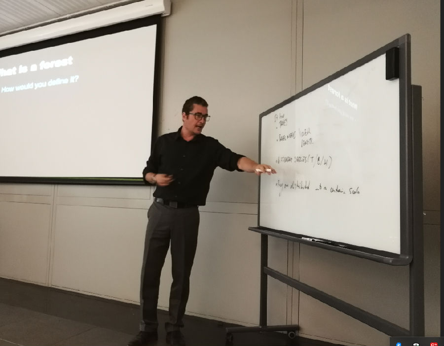 Garcia博士首先通过展示不同的森林案例,与在座的师生们探讨 “森林”的定义。同一片景观地在不同国家对森林的定义下,呈现出不同的结论。在热烈讨论下,听众们赞同对“森林”的定义可以是面积大于0.5公顷,树木高度大于5m,森林覆盖度大于10%的景观地。全球总共134亿公顷的土地,其中40亿公顷是森林覆盖,而这40亿公顷中,14亿公顷为保护地。全球的粮食生产地是15亿公顷,面积几乎与森林保护地相当。在这样的情形下,生物多样性的变化格局值得全球关注。在生物多样性模型的建立中,涉及到三个尺度:现实性、准确性和普遍性。Garcia博士课题组在非洲刚果盆地的研究围绕当地土著民的生计活动与森林生物多样性保护之间的矛盾,综合考虑现实性与普遍性,通过博弈游戏建立起生物多样性未来变化格局的认知。通过一系列的博弈模型,让当地土著民理解生态过程以及其他利益相关者的行为,让管理者与土著民达成共识,做出更明智的决策。