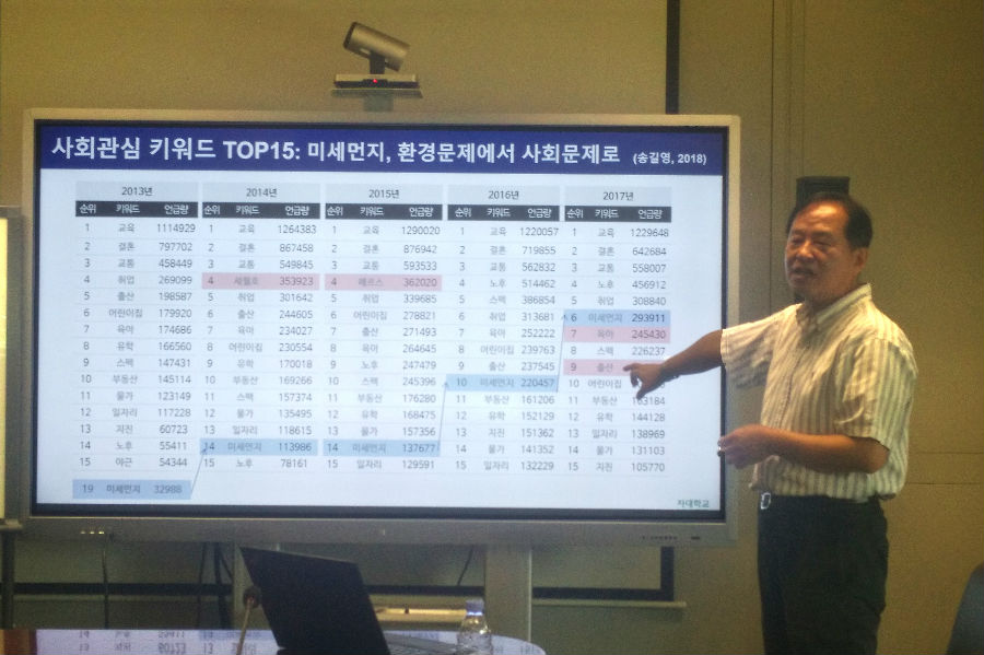 江南网页版2018年05月24日电(通讯员 乔晓慧)5月24日上午,韩国梨花大学教授Yong Pyo Kim做客环境学术沙龙第422期,做了题为《根据气溶胶的化学组分、粒径分布和混合状态估算气溶胶的光学性质》(Estimation of aerosol optical properties based on the chemical composition, size distribution, and mixing types of aerosols)的学术报告。本次沙龙由大气污染控制教研所蒋靖坤教授主持,20余名师生听取了报告。