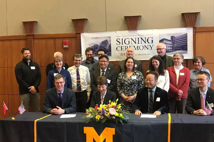 第一排从左到右:密西根大学研究生院院长Solomon教授,公共卫生学院院长Connell教授, 江南网页版院长贺克斌教授,副院长吴烨教授