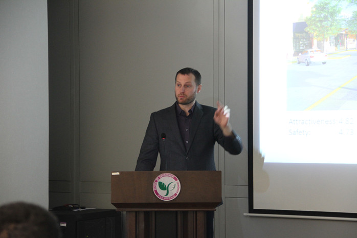 Brent Chamberlain博士重点介绍了关于中国民众对空气污染的诱因及健康影响的认知程度方面的研究工作。研究以京津冀地区居民为样本,采用微信等社交媒体进行线上问卷调查。在主要污染源方面,发电厂、制造业工厂、交通是认知中最主要的三类污染源。调查显示,民众担心空气污染对健康的影响,也愿意主动举报违规行为,但对于新颁布的空气质量法案,民众的认识度还不够,需要进一步教育普及。此外,Brent Chamberlain博士还介绍了利用三维可视化技术对不同街景设计认知的调查研究。该研究主要是通过模型模拟开展面向公众意愿的道路规划。将停车场、座椅、绿化、自行车道等基础设施纳入设计框架,结合三维可视化再现手段,调研不同个体的安全指数及吸引度。其中,绿化是最受调研者欢迎的基础设施。在讲座结束后,Brent Chamberlain博士与到场的师生进行了深入的沟通与交流。