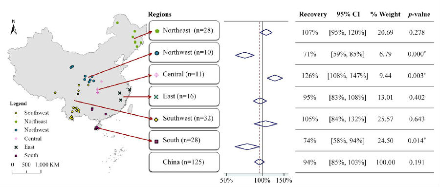Scientific Report上发表的《中国次生林木本植物丰富度恢复:Meta分析研究》(Recovery of Woody Plant Species Richness in Secondary Forests in China: a Meta-Analysis)(文章链接:https://doi.org/10.1038/s41598-017-10898-7)利用Meta分析方法对国内外文献进行系统检索分析、建立数据库,首次揭示了全国范围内次生林木本植物丰富度的恢复格局,结果显示中国次生林木本植物丰富度接近天然林水平。该研究为中国次生林的可持续管理提供了基础信息。