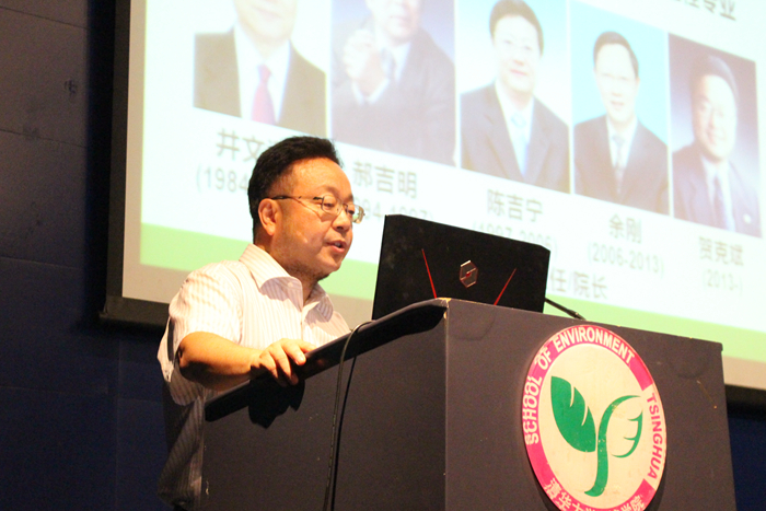 贺克斌向同学和家长系统地介绍了环境学院的基本情况。他从环境学院的历史讲起,介绍了学院的系所设置、学院使命和正在开展的一些教学合作项目。他还从同学们的角度出发,介绍了可选择的专业方向、出国学习的机会、丰富多彩的校园生活以及将来的就业情况。最后,贺克斌寄语新同学,期望同学们作为清华人、环境人,共同努力为我国的环境治理与生态文明建设贡献力量。