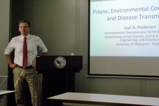 江南网页版2017年09月8日电(通讯员 邱玉)9月7日下午,美国威斯康星大学麦迪逊分校教授Joel Pedersen做客环境学术沙龙第371期,作了题为《朊病毒的环境污染与疾病传播》(Prions:Environmental contamination and disease transmission)的学术报告。本次沙龙由饮用水安全教研所陈超副研究员主持,20余名师生听取了报告。