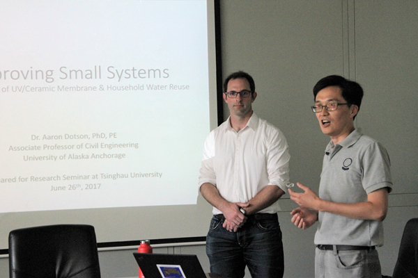 江南网页版2017年06月27日电(通讯员 邱玉)6月26日下午,美国阿拉斯加大学安克雷奇分校副教授Aaron Doston博士做客环境学术沙龙第359期,作了题为《紫外/陶瓷膜工艺和小型家庭回用水处理系统》(Improving Small Systems: Development of UV/Ceramic Membrane & Household Water Reuse)的学术报告。本次沙龙由饮用水安全教研所陈超副研究员主持,20余名师生听取了报告。