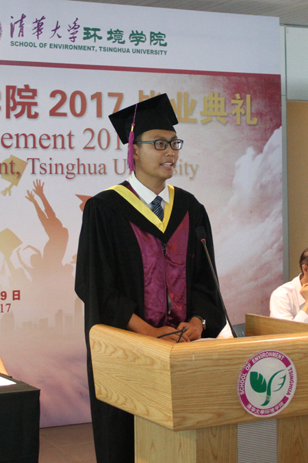 中持环保发展有限公司董事长许国栋作为校友代表致辞。许国栋说,未来五十年将是一个创变的时代,科技将推动社会产生深刻地变革,中华民族的环境梦也将在未来五十年基本形成,环境事业将从污染治理逐步过渡到环境的修复、建设、创造与融合,这对于各位毕业生来说是极大的机遇和责任。最后,他以“肩负社会责任”与学弟学妹共勉,期望清华人勇于肩负推动进步、造福人民的责任,以责任担当为母校增添更多荣光。