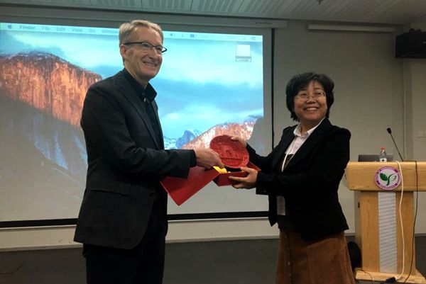 Skidmore教授首先介绍了可持续粮食生产的定义,指出利用遥感技术评估粮食生产的可持续性是全球众多政府、企业和NGO关注的重点。随着技术的发展,遥感的准确度和可重复性在提高。遥感技术主要通过以下几个指标来评估景观可持续性:生物量、粮食产量、关键物种和旗舰物种(植物、鸟、动物)、土壤湿度和土壤侵蚀。此外,Andrew Skidmore教授还介绍了利用遥感技术分析景观破碎化和景观重组化的案例,如对中国朱鹮的生境分析。在讲座结束后,教授与到场的师生进行了深入的沟通与交流。刘雪华向Skidmore教授赠送了清华纪念品以表达感谢。