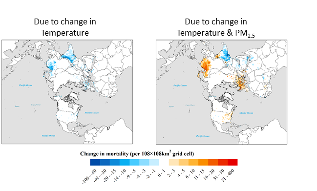 颗粒物的辐射效应导致早逝人数的变化:仅考虑温度的响应(左图),综合考虑温度和PM2.5浓度的响应(右图)