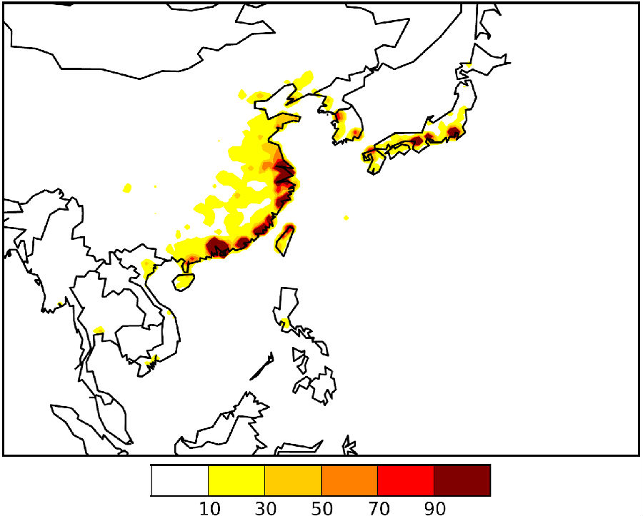 东亚船舶排放导致的过早死亡人数(每0.5度网格)