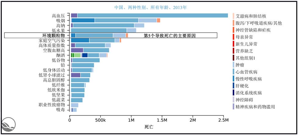 据2015年10月发表于英国医学杂志《柳叶刀》上的全球疾病负担(GBD)2013 估计,2013 年,暴露于环境细颗粒物空气污染(PM2.5)导致中国有91.6 万人过早死亡。“GBD 是迄今为止最大和最全面的衡量全球流行病水平和趋势的项目(www.healthdata.org/gbd)。基于中国数据,我们发现室外空气污染是第五个导致中国过早死亡的主要原因。”中国疾病预防控制中心国家非传染性及慢性疾病控制预防中心副主任、2013年GBD中国分析的主要作者周脉耕表示。