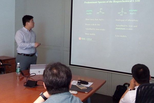 孙文杰博士重点介绍了他在缺氧硝酸根还原条件下亚砷酸氧化方面的研究工作。在缺氧硝酸根还原条件下,亚砷酸(三价砷)可以在微生物作用下转化成毒性较小和流动性更小的砷酸(五价砷)。同时,溶解度高的二价铁也可以被硝酸根厌氧氧化成三价铁的固态氧化物。三价铁氧化物作为砷的有效吸附剂可以高效的去除水体中的砷,从而显著降低地下水中砷的含量并消除对公共卫生的危害。此外,孙文杰博士还介绍了垃圾填埋场硫化氢产生的检测方法 (Methods to Measure the Hydrogen Sulfide Production Potential of Sulfate-Containing Wastes in Landfills)。该研究主要是通过实验室方法设计和验证各种含硫化合物在垃圾填埋场条件下产生硫化氢的释放潜能和降解速率。该研究还发现硫化氢对产硫菌和产甲烷菌产生不同的抑制作用。该研究成果可以进一步优化垃圾填埋场产硫化氢的预测模型。在讲座结束后,孙文杰博士与到场的师生进行了深入的沟通与交流。