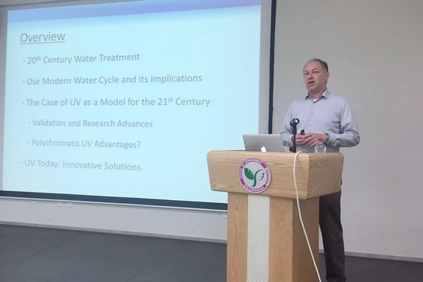 报告中,Karl G. Linden教授首先回顾了20世纪以来美国采用砂滤、氯消毒等水处理技术后水媒传染病大幅度下降的情况,但仍面临水中新的病原体、处理过程中使用化学品(氯)、水质口感差等问题,而理想的水处理过程中应该不使用有害化学品、不产生副产物、耗电量低、反应快、容易操作。紫外光照消毒法(UV)作为一种绿色环保的技术,既能杀死水中病原体,处理过程中也没有化学品参与,且没有副产物产生,是21世纪先进的水处理技术。UV消毒法的原理是干扰DNA复制的过程,从而杀死细胞、病毒、原生动物,研究发现杀死不同生物所需的UV剂量不同,但UV法较二氧化氯/臭氧/氯胺等消毒法有较大的优越性。目前UV消毒法已经证实可以实现地下水法规对水质的要求,并且得到美国环保署的认可和推广,已经在所有种类的表面水体中得到应用, UV消毒法已经是纽约、波士顿等城市水处理过程的必备流程,它一般安装在快速沙滤池之后。
