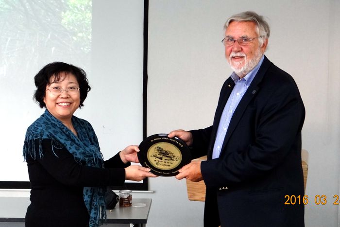 环境学院2016年3月24日电(通讯员 王丝可) 3月24日下午,美国海湾大学艾维格来得(Everglades)湿地公园主任、俄亥俄州立大学(The Ohio State University )名誉教授威廉·密茨(William Mitsch)做客清华环境论坛第84讲,作了题为《令人震惊的磷、氮和碳! 湿地在减轻我们景观及全球污染物中的作用》(Phosphorus and Nitrogen and Carbon, OH MY! The role of wetlands in mitigating pollutants in our landscape and globe)的学术报告。环境生态学教研所刘雪华副教授主持了此次论坛,近50名师生听取了报告。