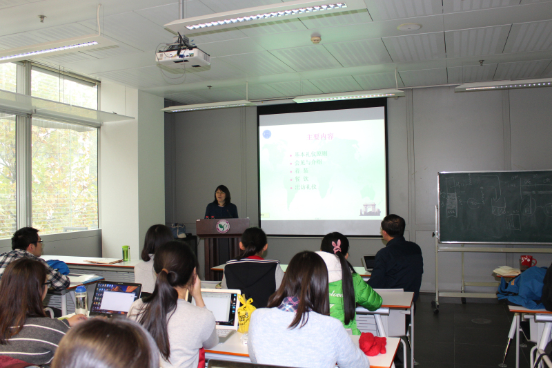 环境学院2015年11月12日电(通讯员 赵倩)11月12日,全球环境国际班邀请了清华大学海外宣传办公室国际礼仪专家陈红为同学们上了一堂精彩的国际礼仪课。讲座由国际班责任教授余刚主持,班主任岳东北、项目秘书赵倩和辅导员黄海也参加了本次讲座。