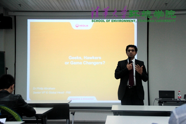 环境学院2015年4月16日电(学生通讯员 李抒苡)4月16日下午,威立雅环境研究与创新中心高级副主管菲利普·亚伯拉罕(Philip Abraham)博士做客环境学院学术沙龙第228期,作了题为《创新与市场:研究人员、商人还是改变大局的赢家》(Innovation & Marketing: Geeks, Hawkers or Game Changers)的报告。环境化学教研所余刚教授主持此次沙龙,40余名师生听取了报告。