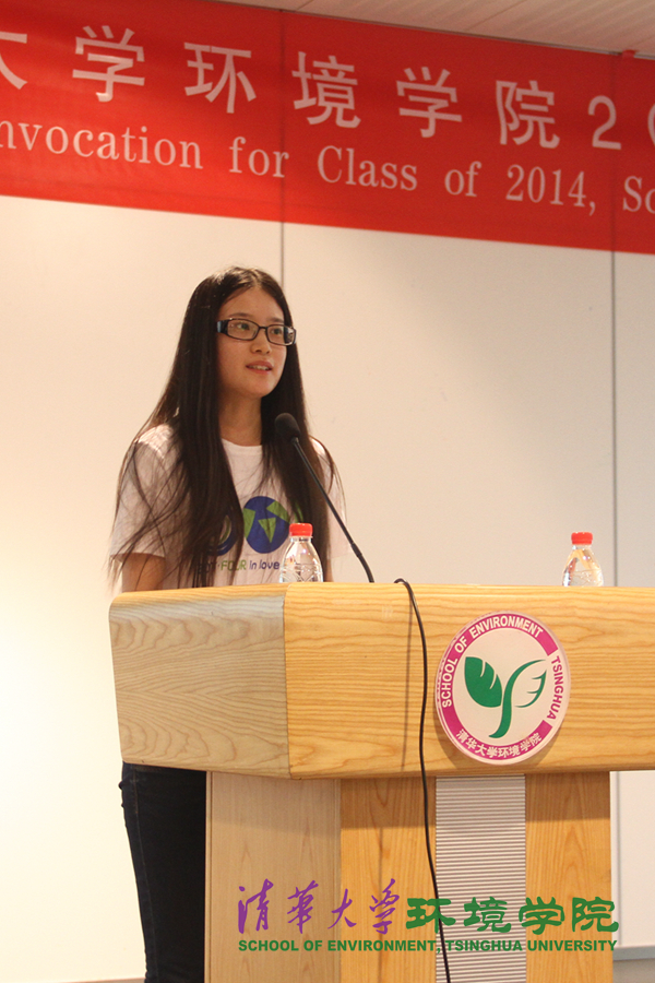 随后,本科生孙冬雅和研究生王浠分别作为老生代表发言。孙冬雅以三个关键词——幸运、创新、勤奋,总结自己本科三年的学习生活。作为男女比例和谐的少数院系之一,环境学院给学生提供科研、文艺、体育等各方面的平台。孙冬雅说,“清华是一方沃土,不管是什么兴趣爱好,不管或大或小,每个人的梦想都会生根发言”。王浠则给新生提出三点建议,第一,珍惜缘分,相聚在环境学院本身就是一段幸运和缘分;第二,及时归零,“清华老中医,专治吹牛皮。”希望大家忘掉曾经的光辉岁月,成为各自领域的“达人”;第三,不忘初心。不管走到哪里,都要鼎力前行,“为实现山更绿、水更清、空气更加洁净的环境梦努力奋斗!”