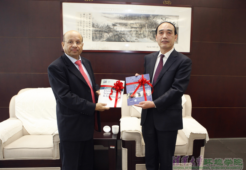 会谈后,双方互赠礼物。亚行副行长罗哈尼赠予袁驷校长“亚洲水发展展望2013”;袁驷校长回赠亚行副行长一同行评鉴杂志“环境科学与工程前沿(FESE)之水安全专刊”。