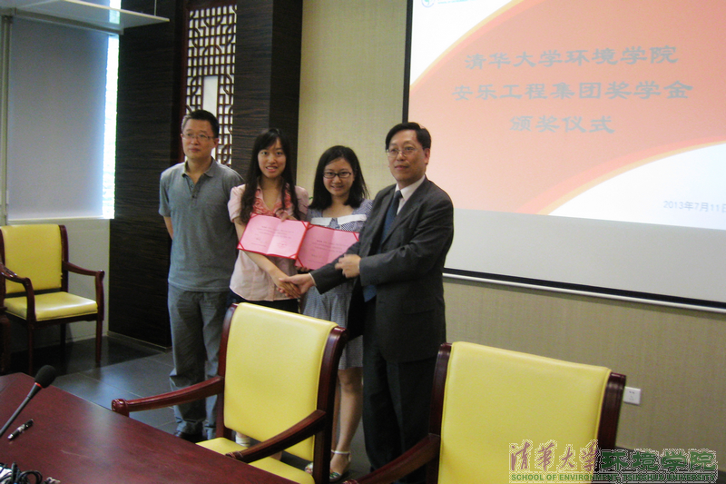 清华环境学院7月11日电 (通讯员 杜卓) 7月11日上午,2012~2013学年度安乐工程集团奖学金颁奖仪式在环境节能楼205会议室举行。环境学院党委书记杜鹏飞、安乐工程有限公司总监陈海明、安乐设备安装工程(上海)有限公司北京分公司总经理王雅昌出席颁奖仪式。环境学院党委副书记刘建国主持仪式。2012~2013学年度,环境学院共有两名大四本科生获颁奖学金。
