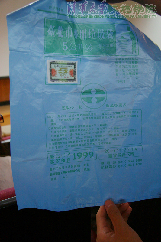 图为台北市专用的带防伪标识的垃圾袋。袋上标注了制造、贩售和使用假垃圾袋的相应处罚手段,包括有期徒刑和罚款等。