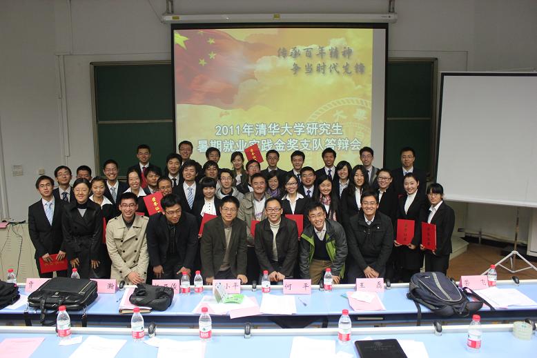 10月26日,2011年清华大学研究生暑期就业实践金奖支队答辩会在旧经管报告厅举行,校党委研究生工作部副部长黄晟,校团委副书记、校研究生团委书记王磊等七位老师担任评委嘉宾,来自不同院系的15支支队进行了风采展示和现场答辩。环境学院载誉而归,共有三支队伍获得实践表彰。赴上海市政院支队获“金奖支队”称号及“最佳展示奖”,赴浙江省城乡规划设计研究院支队、赴江苏省城市规划设计研究院支队获“铜奖支队”称号。