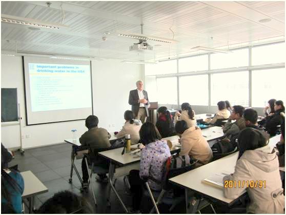随后,在向同学们简略介绍了景色优美而历史悠久的伊利诺伊大学后,斯诺因克教授向大家揭示了美国饮用水方面存在的问题,如:水资源短缺、年久失换的饮用水供应系统、由于水运输而造成的能耗以及废水利用问题等。这些都使同学们认识到:水资源问题是一个全球性的问题,解决水资源问题刻不容缓。