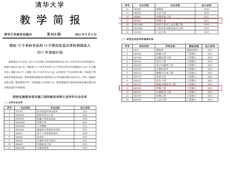 近日,根据教育部办公厅公布的《关于公布卓越工程师教育培养计划2011年学科专业名单的通知》,环境学院环境工程学科入选本科专业和研究生层次学科领域2011年卓越计划。