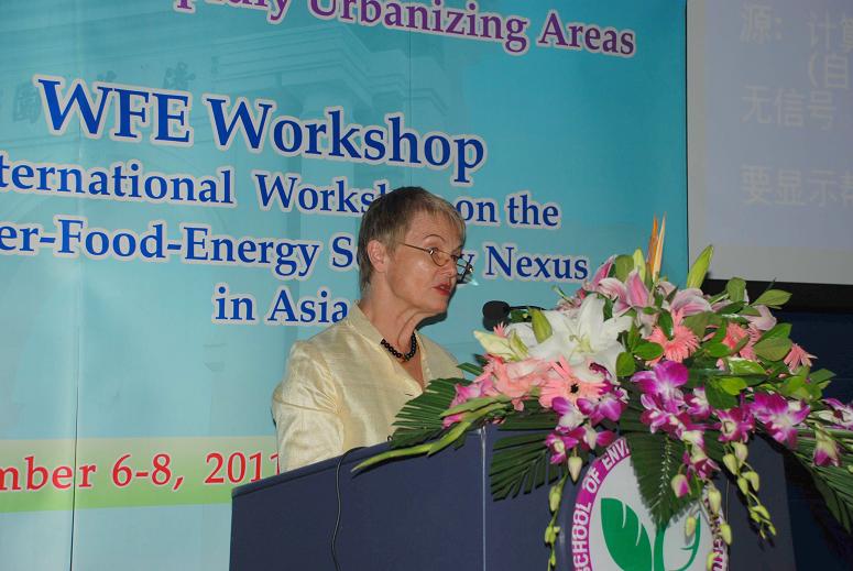 亚洲开发银行副行长乌苏拉•普罗伊斯做了开幕式主旨发言。她表示,亚洲开发银行致力于提高水资源利用效率。当前包括中国在内的许多亚洲国家都面临着水资源短缺的威胁。水资源紧张导致农业灌溉用水不足,从而导致粮食产量减产,粮价上升。而能源需求量的增加亦会提高对水资源的需求。因此,水安全、粮食安全和能源安全息息相关。在发言中,乌苏拉对水安全、粮食安全和能源安全提出了若干框架性解决方案,并敦促各方进行合作和信息共享。