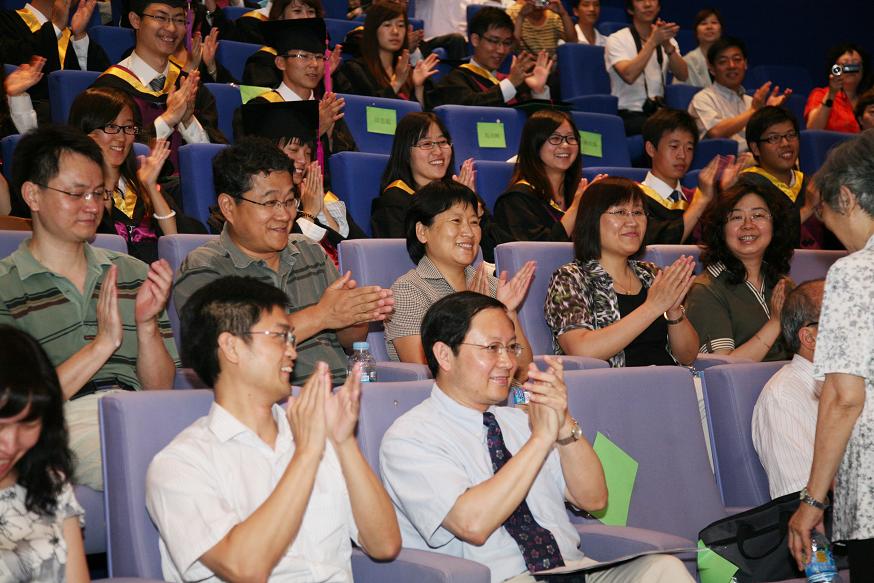 环七年级班主任代表温宗国老师一登台便引得全场爆发出阵阵笑声。他操着一口地道的南方普通话,与同学们一起重温了军训拉练时的艰苦、学习和找工作时的迷茫、恋爱牵手时的浪漫以及男生节女生节的彻夜不眠。他向同学们坦陈:“你们一定抱怨,班主任平时太忙都见不着,见到了就是谈话,找你们的问题。但是毕业了你们发现,都是纸老虎。老师们还是刀纸(子)嘴,豆腐心。”对环七年级的几个班,温老师毫不吝惜溢美之词,用幽默又不失时尚的语言给予了同学们最高的褒奖:“环71班性格不同,风格迥异,但意切情真。你们在07年中秋节晚上给我传来了中秋祝福,与你们同行的这种快乐就是我最宝贵的财富。你们贡献了四分之三的院团委副书记,六分之三的学生会副主席。环72班活力四射,积极向上,成绩优异,体育、文艺、社工、科研全面发展,班级也有80%获得过学校的各类奖学金,连续三年获得优良学风班。环73,含蓄而内心火热,淡定而温馨靠谱,简称闷骚。参加社会实践,志愿者行动,平凡和细节中见真情。”毕业典礼上他仍不忘苦口婆心地叮咛:“要在这个神马都是浮云的年代坚持自己的理想”,“要积极乐观,一帆风顺只是人生的一小段,挫折将伴随着你们的人生旅途,要学会淡定。”他还颇有创意地自创小诗寄语同学:“你们一定要经常回来,告诉我们过得怎么样。多年以后,你们来,或者不来,我们就在这里,学院也在这里,不舍不弃;见,或者不见,我们的心永远在一起,不分不离。”