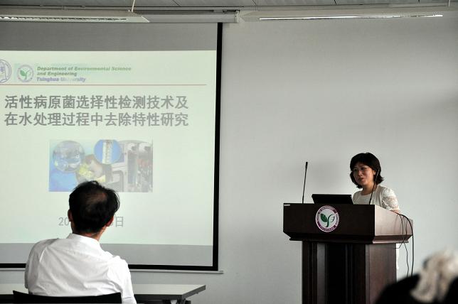 何苗老师就“活性病原菌选择性检测技术及在水处理过程中的去除特性研究”做了汇报。她首先向大家介绍了对水环境中病原菌进行监测控制的重要性,然后对几种分子生物学监测技术做了对比分析,并着重讲解了PMA-qPCR检测技术在病原菌检测方面的应用。