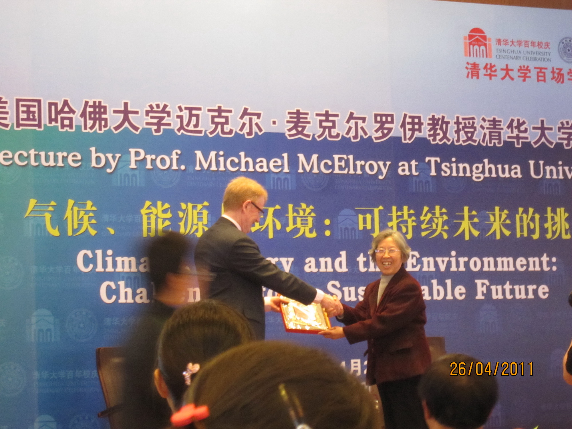 麦克尔罗伊教授首先介绍了地球上全年和全球意义上的能量平衡状况,以及地球上的垂直气温分布,指出温室效应导致全球气温升高,并向大家讲解了导致产生温室效应的几种温室气体,它们在历史上的浓度变化,和它们对全球气候的影响。麦克尔罗伊在报告中指出,中美两国是世界上二氧化碳排放量最大的国家,这与两国化石能源的消耗紧密相关。因此开发新的替代性能源势在必行。麦克尔罗伊教授分别介绍了中美两国的风力发电现状,指出两国在风力能源利用上还存在巨大的潜力。他提出,两国应在新能源开发利用和研究上大力合作,为建设可持续发展的未来共同努力。