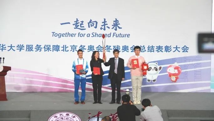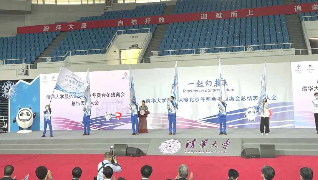会上,冬奥闭幕式标兵志愿者刘玉凤同学作为标兵演员组旗手出旗,庆祝圆满完成冬奥志愿任务,光荣凯旋。