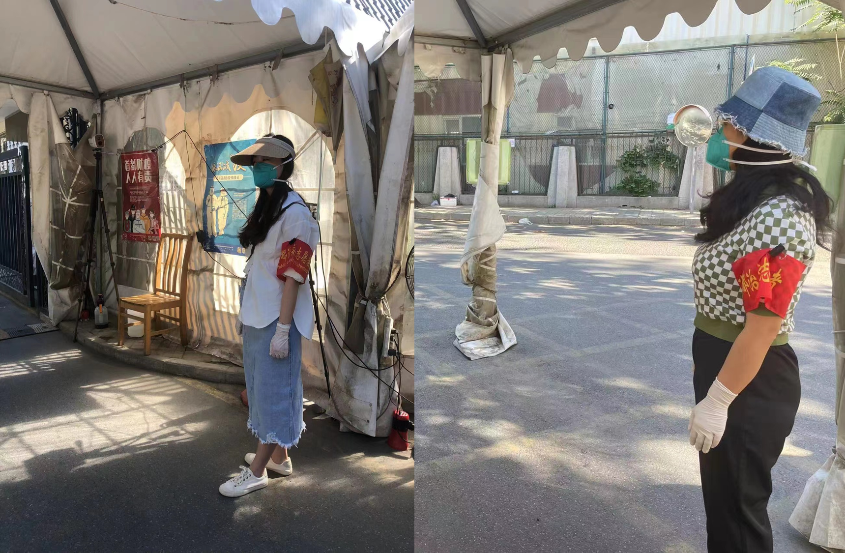 赵彬(左)和赵婧(右)分别参加清华大学西北社区南门值守工作