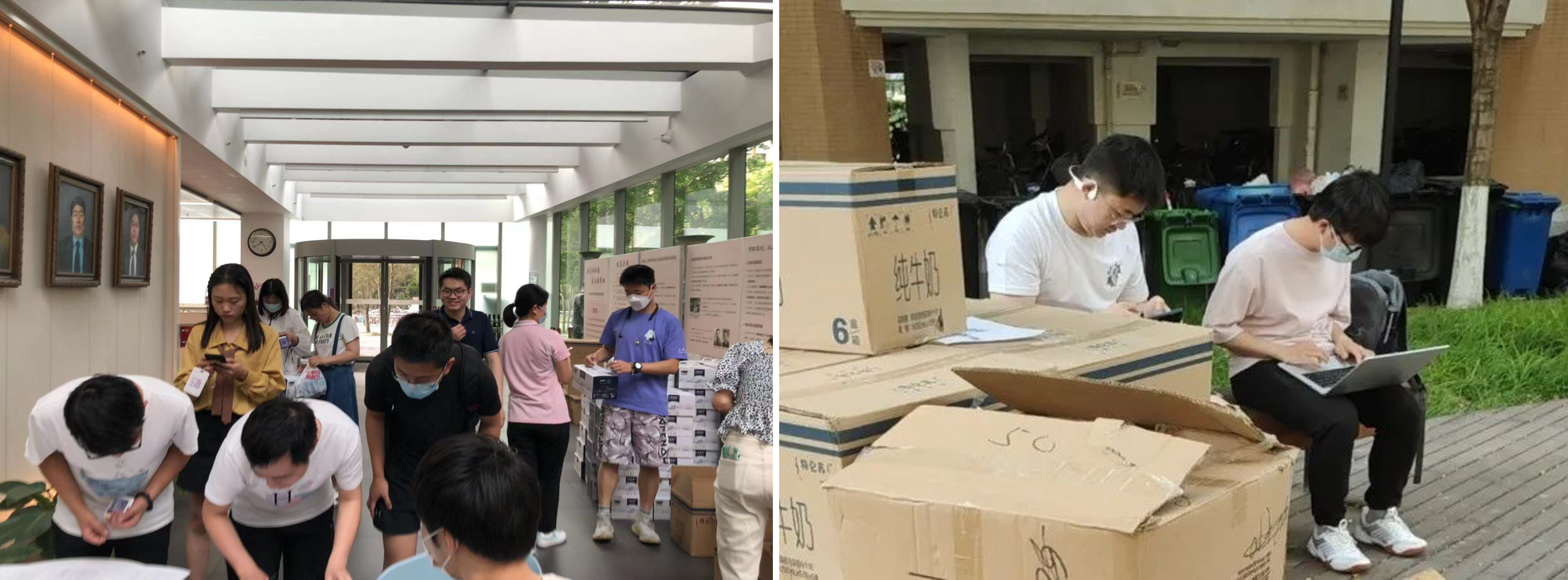 学生骨干们发扬不怕苦、不怕累的精神,积极服务同学,为同学们鼓劲儿,组织各种活动丰富同学们的生活,为同学们送去了一份份感动。在端午节到来之际,学院为在校学生准备了消暑防疫礼包。为了让同学们及时收到学院的节日祝福,学院团委、研究生会、学生会的骨干们一起在前期筹备过程中反复讨论敲定了礼包中的物品清单;在整理物资时,他们流水线作业,花了整整三个半小时才将整箱整箱的物资分装、打包成同学们收到的一个个礼包;在运送过程中,他们认真清点物资数量、保证数量上没有误差;在分发过程中,他们轮流值班并通知尚未领取的同学及时领取,他们在闷热的夏天值守在蚊子众多的宿舍楼下等待同学们来领取礼包……忙碌了两天,最终将660份抗疫礼包送到同学们手中。“如果你突然打了个喷嚏,那一定是学院在想你”,学院研团志愿部负责人薛博元幽默地说。