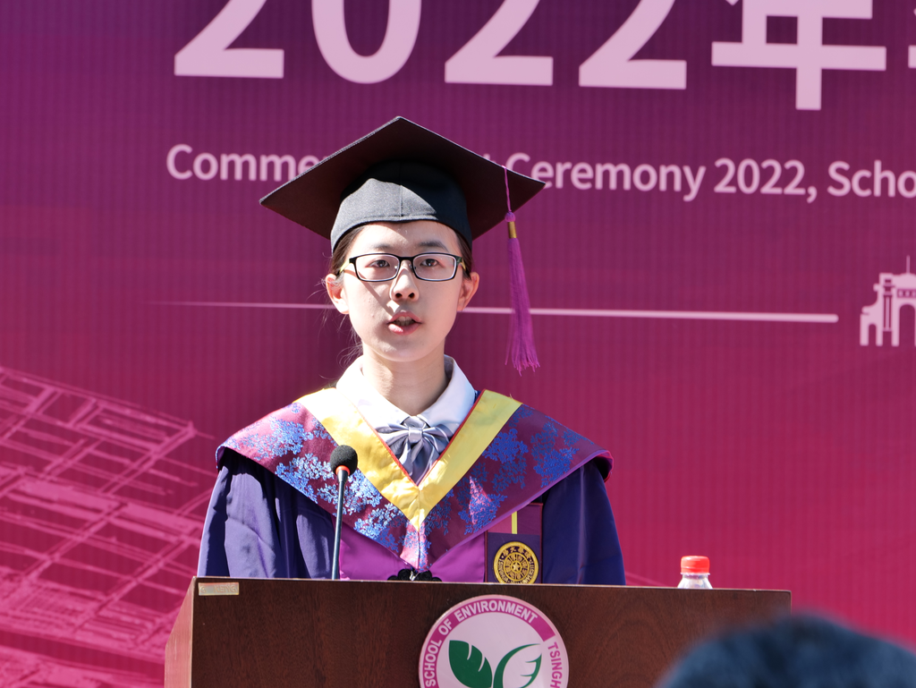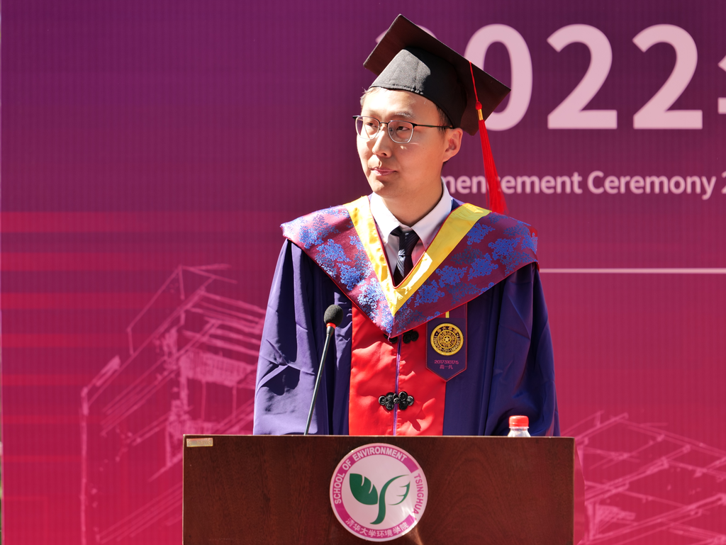 环82班胡邀月代表本科毕业生发言。她回忆了环8年级同学认识自我、个性发展的历程,以及在集体中携手并肩、共同成长的美好青春,立志与大家一起脚踏实地、勇担使命,用实际行动续写共同的青春答卷。2017级博士生高一凡作为研究生毕业生代表发言。他对学院深沉的家国情怀、浓厚的科研氛围、细致的关爱呵护表达感谢,并号召全体毕业生共同实践和传承,让世界因环境人而更美丽。