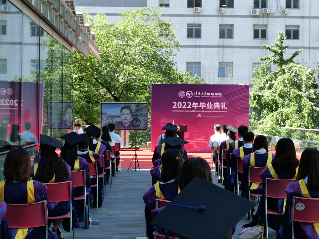 初夏时节,骊歌奏响。6月24日上午,环境学院2022年毕业典礼在中意清华环境节能楼室外平台以线上线下相结合的方式隆重举行。环境学院2022届毕业生,环境学院院长刘毅、党委书记刘书明,学校研究生院副院长吴烨,学院副院长岳东北、蒋靖坤、兰华春,学院党委副书记吴静、席劲瑛,校友代表冯旭,各系主任,毕业班班主任、辅导员及机关部分职工共100余人参加典礼。典礼由席劲瑛主持。本次毕业典礼特别开设了直播,供无法到校参与的师生及亲友线上参加。