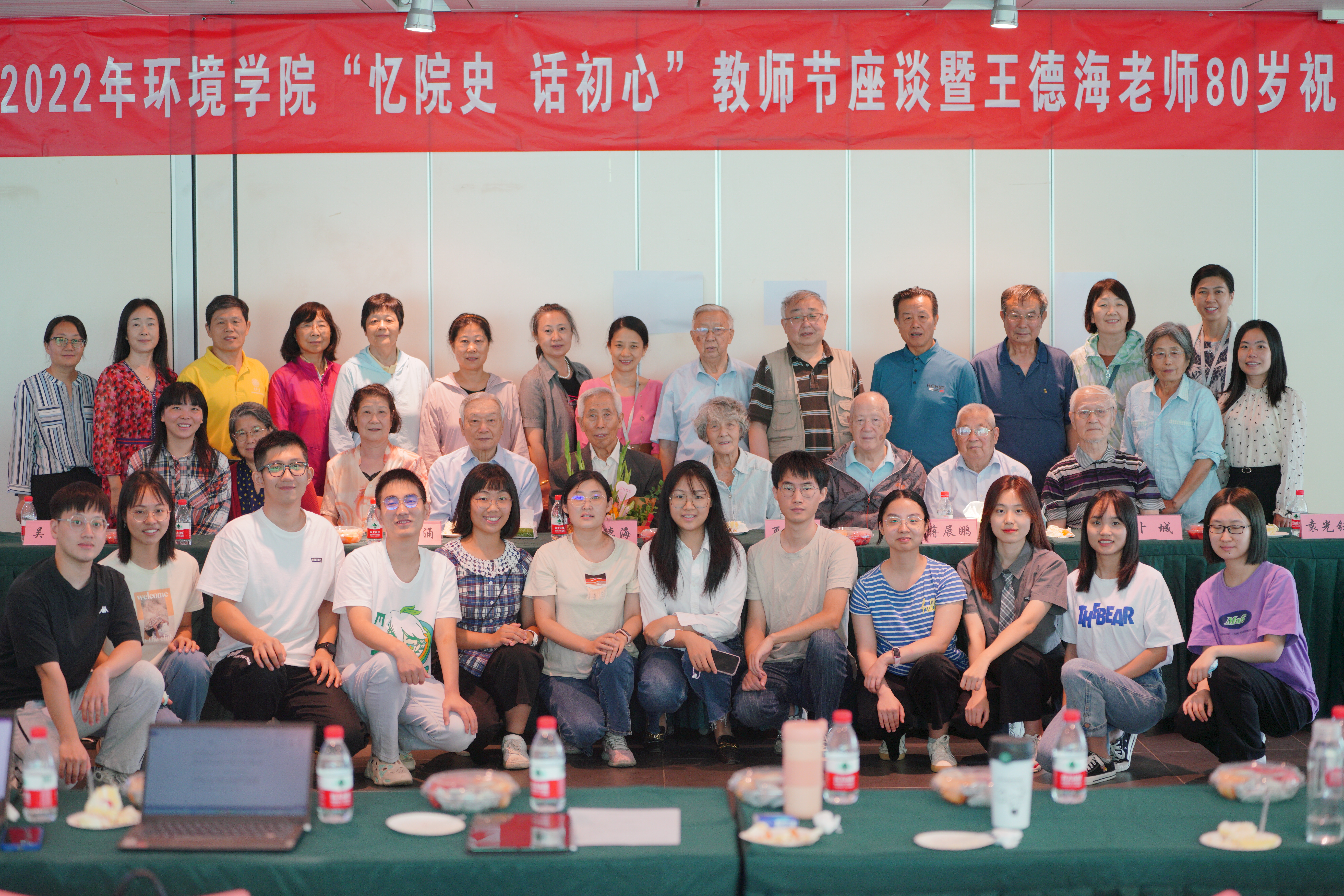 江南网页版2022年9月11日电(通讯员 张琦 高澜 魏欣)9月8日上午,在第38个教师节到来之际,环境学院在东一厅举办2022年环境学院“忆院史 话初心”教师节座谈暨王德海老师80岁祝寿会。学院党委书记刘书明、党委副书记吴静,22位离退休教师、环博221新生党支部12名学生和机关支部代表参加了座谈会。吴静主持座谈会。