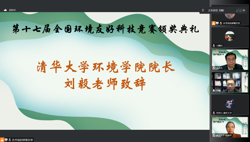 刘毅首先致辞。他向获奖选手表示祝贺,并对赛事组委会及参与赛事筹备和组织工作的老师、同学们表示感谢。他回顾了环科赛发展成为全国最大的大学生环境创新创业实践平台的历程与成就,希望环科赛能继续培养学生绿色双创思维与解决问题的实际能力,为我国环境保护事业培养与输送后备人才。