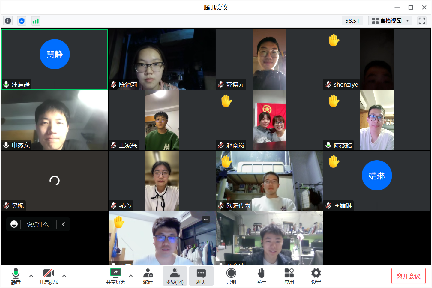 环博221团支部将推优入党工作与学习党的二十大精神专题组织生活会相结合,线上聆听第十四届全国人大代表逄子剑的全国两会精神报告——《踔厉奋发新征程,勇毅前行向复兴》。廖梓童表示:“‘事不畏难、行不避艰’,逄子剑等69名脱贫攻坚驻村干部扎根巴格阿瓦提乡一线,给基层群众带来了生活上翻天覆地的变化,泥巴房变成了安居抗震房,泥土路变成了柏油路,群众齐齐奔小康,这离不开党中央的坚强领导,也离不开高层次人才。强国建设、民族复兴的接力棒,历史性地落在我们这一代人身上。接好棒,我们就是国家未来的希望。”同时,环研二、环研四、环研五、环研六、环博211、环硕211、环博212、环硕221党团支部共131名研究生线上参加了本次两会精神报告学习。