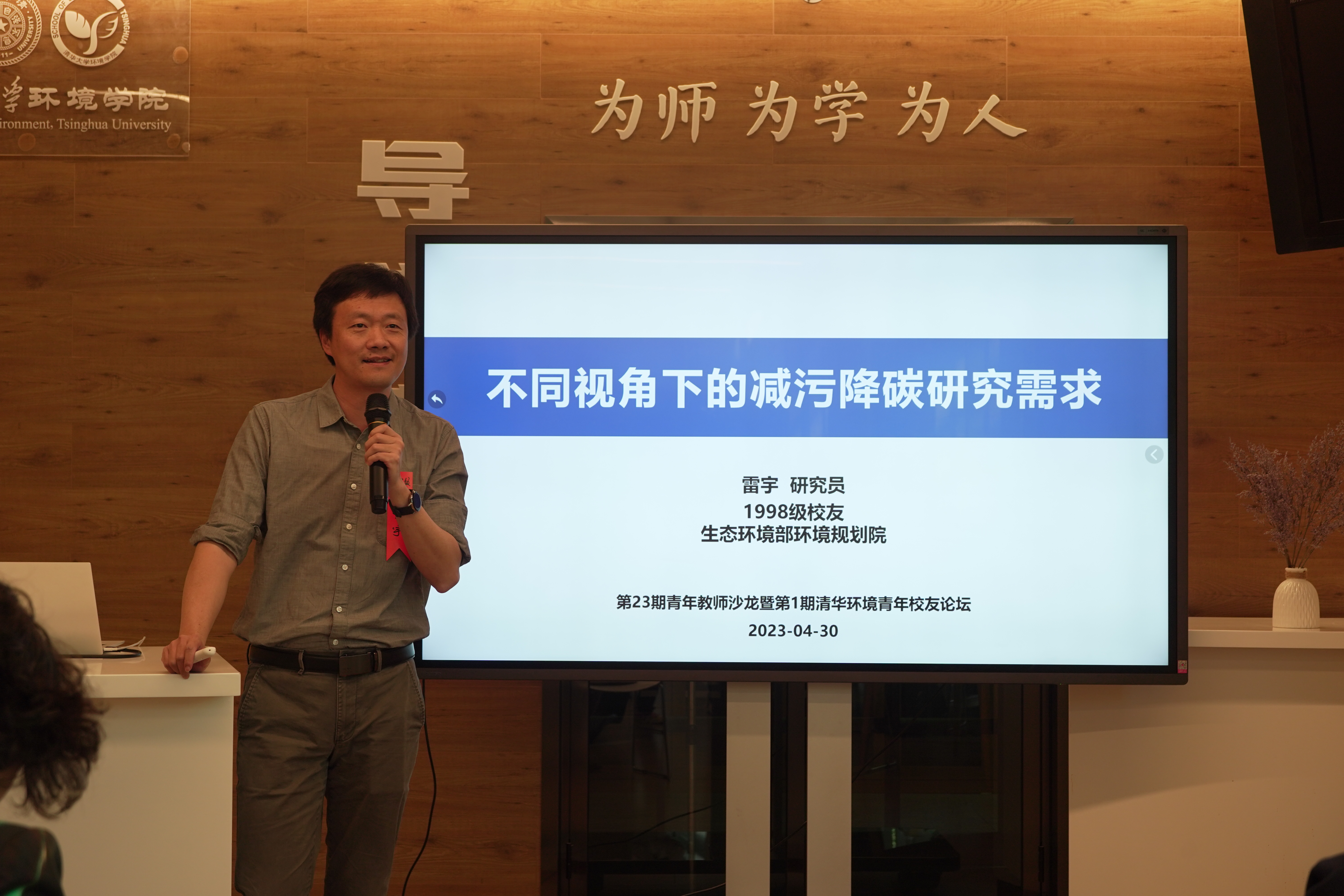 江南网页版2023年5月1日电(通讯员 王春艳 李亚平)4月30日上午,环境学院第23期青年教师沙龙活动暨第1期清华环境青年校友论坛在导学空间举办。活动邀请了1995级校友、环丁环保大数据研究院副所长、南科大工程技术创新中心(北京)副主任钟丽锦,1998级校友、生态环境部环境规划院研究员雷宇,1999级校友、江南网页版教授徐明,2000级校友、中国科学院城市环境研究所研究员陈伟强等围绕减污降碳主题作报告。学院党委书记刘书明、副书记吴静,校友、青年教师等近50人线下参加活动,7000余人次线上参加。活动由2000级校友、江南网页版教授刘欢和2002级校友、复旦大学环境科学与工程系教授张宏亮主持。