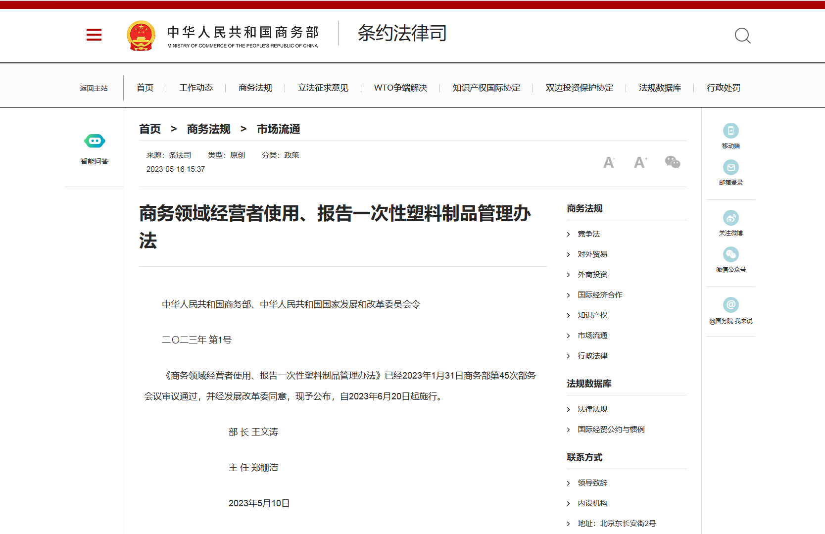 商务部流通业发展司负责人在解读中指出,《管理办法》明确了商务领域经营者规范,主要包括商品零售、电子商务、餐饮、住宿、展览等商务领域经营者有关义务,明确报告主体报告一次性塑料制品的要求、规范、时限等内容,并对执行国家禁止、限制使用塑料制品要求及使用、回收报告活动实施日常监督检查等作出规定。《管理办法》是推动形成绿色低碳的生产方式和生活方式的重要举措,是减少传统塑料使用,协同推进降碳、减污、扩绿的具体行动,对于增强塑料制品绿色替代供给、培育绿色消费理念具有重要意义。
