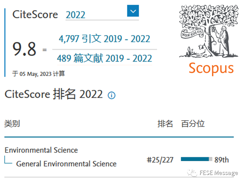 另据爱思唯尔最新发布的 CiteScore™ 2022年度(引用分)指标,FESE期刊的最新引用分为9.8,在General Environmental Science领域排名#25/227。