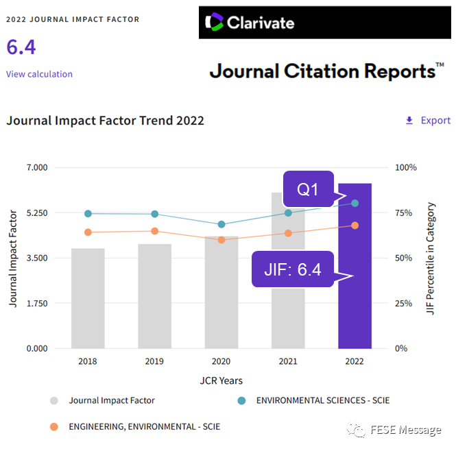 据科睿唯安最新发布的2022年度Journal Citation Report™ 期刊引证报告,中国科技期刊卓越行动计划重点期刊、中国工程院院刊系列Frontiers of Environmental Science & Engineering(FESE)最新影响因子为6.4,在Engineering-Environmental领域排名#18/55,在Environmental Sciences领域排名#54/274,处于JCR Q1区。