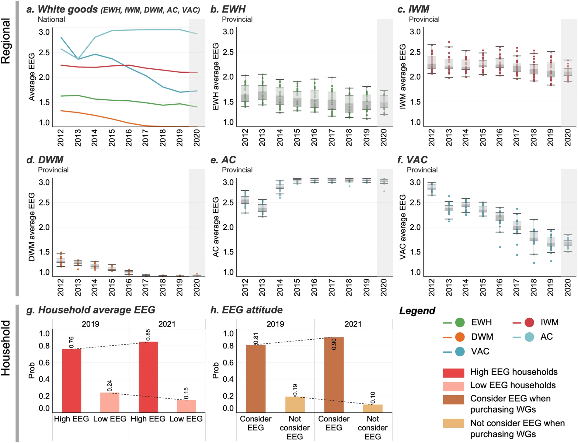 图2 省级和家庭层面的平均能效等级。(a)全国5种白色家电按销量加权的平均能效等级。(b–f)我国内地30个省份按销量加权的平均能效等级分布。(g)家庭现有家电平均能效等级分布。(h)消费者对不同能效等级态度的分布。