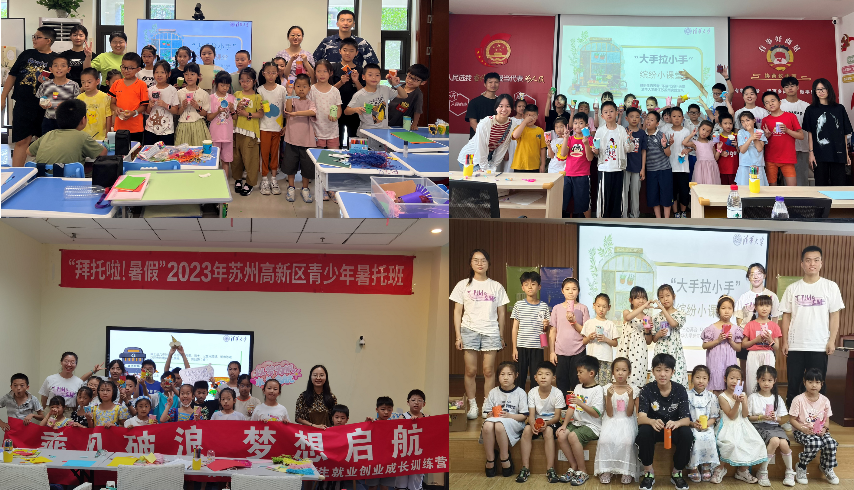 实践期间,实践支队与“拜托啦!暑假”2023年苏州高新区青少年暑托班联动,开展主题宣讲、知识竞答、手工制作和科学实验等活动。在秀岸村党群服务中心开展暑期志愿活动,支队通过科学实验和赠书环节激发当地儿童对探索知识的渴望和对阅读的热爱,并且在座谈环节中为孩子们的成长提供真诚的建议与鼓励。为帮助同学们树立环保理念、培养同学们的绿色情怀并提高日常环保意识,支队成员们在四个暑托班举办“大手拉小手”实践活动,通过大学生活介绍、环保宣讲、知识竞答和手工制作等环节,在与小朋友们零距离的互动交流中传播绿色理念,并辐射带动家庭践行绿色生活方式。